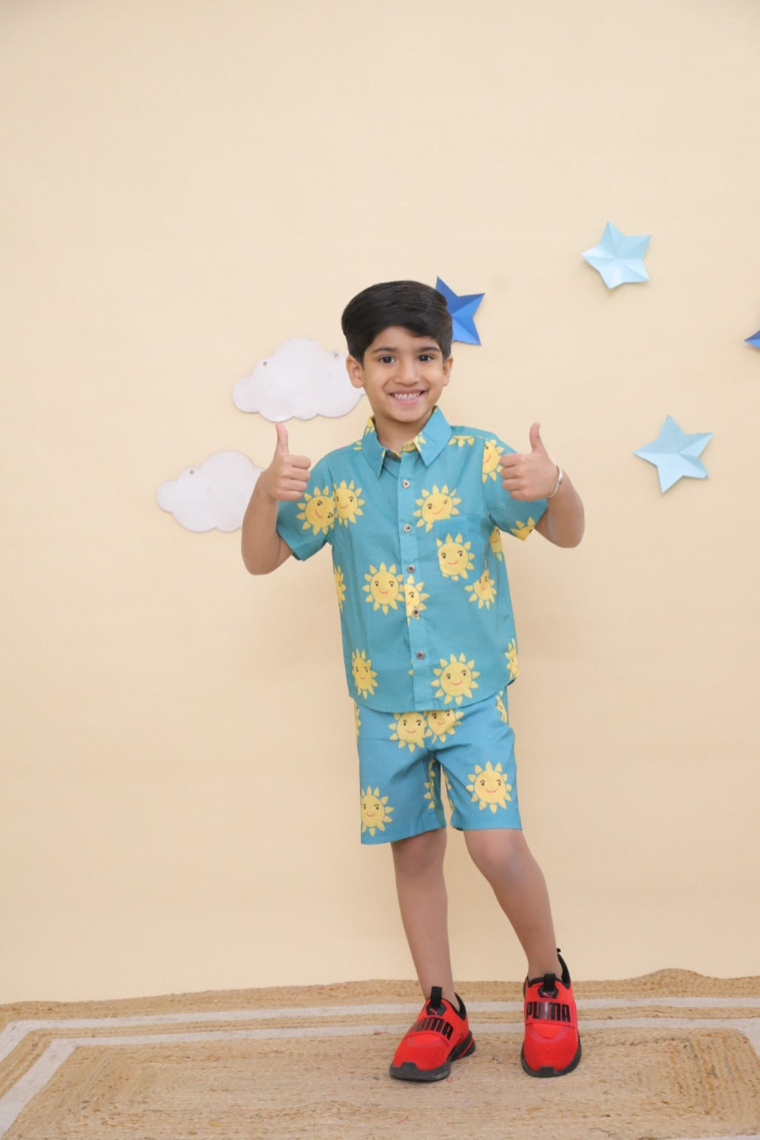Short sleeves teal base with sun print in pure cotton all over print. Comes with a cool matching elasticated waist band shorts, with pocket, kids coords, knee length.