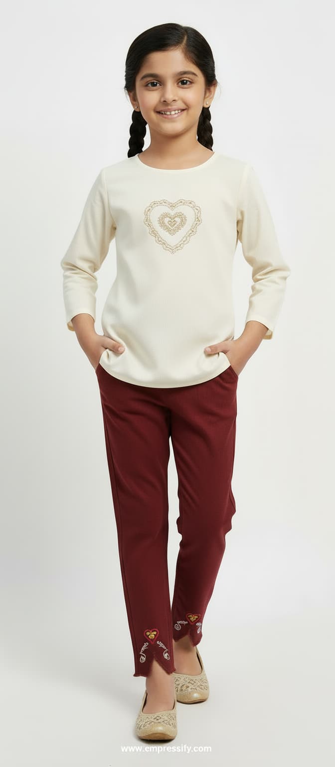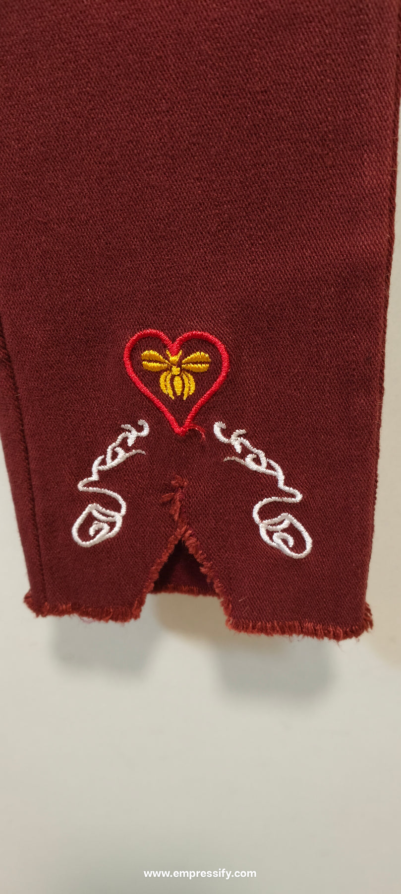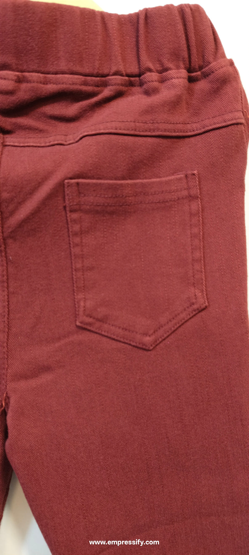 MAROON KIDS JEANS WITH POCKETS, ankle length denim pants, with 2 front pockets and 2 back pockets, fancy embroidery work on ankles.
